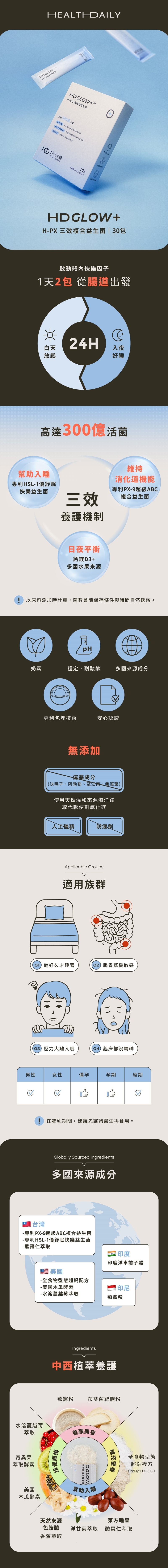 精選專利HSL-1優舒眠快樂益生菌、PX-9 超級ABC複合益生菌,補充多株好菌。搭配洋車前子及松谷纖維高效益生元促進益菌定殖,發揮雙重益生力。採用專利包埋技術,耐胃酸膽鹼,提升菌種穩定性與存活率,更添加多國來源成分與天然香蕉萃取色胺酸,幫助消化及排便順暢同時也能幫助入睡。