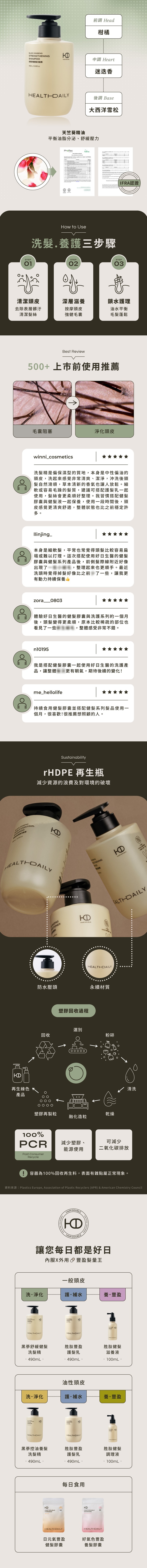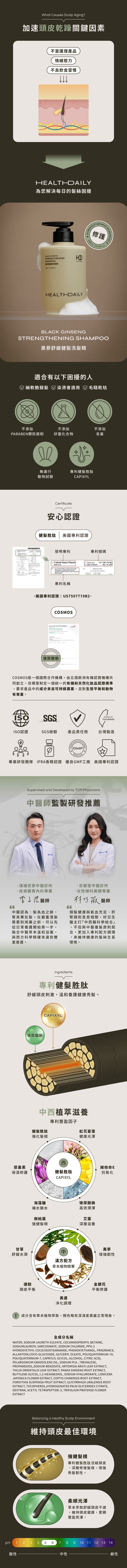 添加專利健髮胜肽活絡頭皮、深層修復髮根,搭配草本萃取舒緩頭皮不適,維持頭皮健康,增強秀髮的強度韌性。