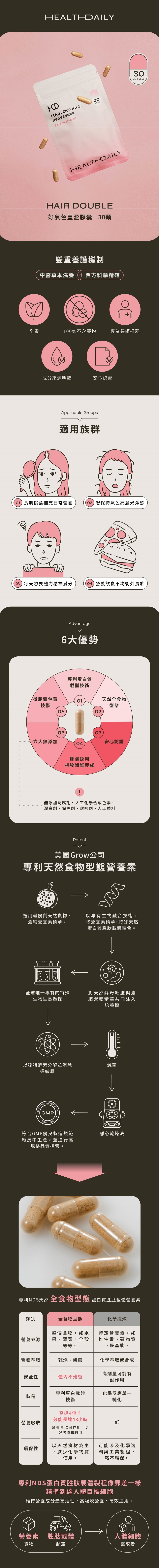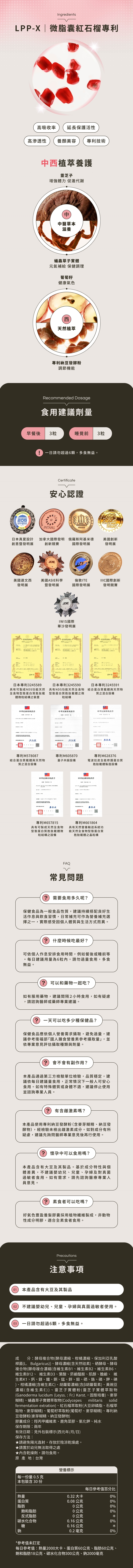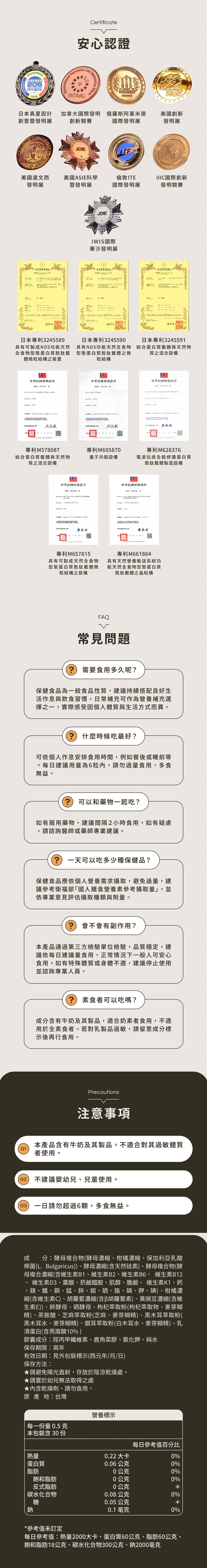 成分|酵母複合物(酵母濃縮、柑橘濃縮、保加利亞乳酸桿菌(L. Bulgaricus))、酵母濃縮(含天然硅素)、硒酵母、酵母複合物(酵母複合濃縮(含維生素B1、維生素B2、維生素B6、 維生素B12、 維生素D3、葉酸、菸鹼醯胺、肌醇、膽鹼、 維生素K1、鈣、鎂、鐵、銅、錳、鋅、鉬、硒、鉻、磷、鉀、碘)、柑橘濃縮(含維生素C)、胡蘿蔔濃縮(含β胡蘿蔔素)、黃豌豆濃縮(含維生素E))、靈芝子實體粉(靈芝子實體萃取物(Ganoderma lucidum (Leyss. : Fr.) Karst.,固態培養)、麥芽糊精)、蛹蟲草子實體萃取物(Codycepes militaris solid fermentation extration)、紅石榴萃取粉(大豆卵磷脂、石榴萃取物、麥芽糊精)、葡萄籽萃取粉(葡萄籽、麥芽糊精)、專利納豆發酵粉(麥芽糊精、納豆發酵物)膠囊成分:羥丙甲纖維素、鹿角菜膠、氯化鉀、純水